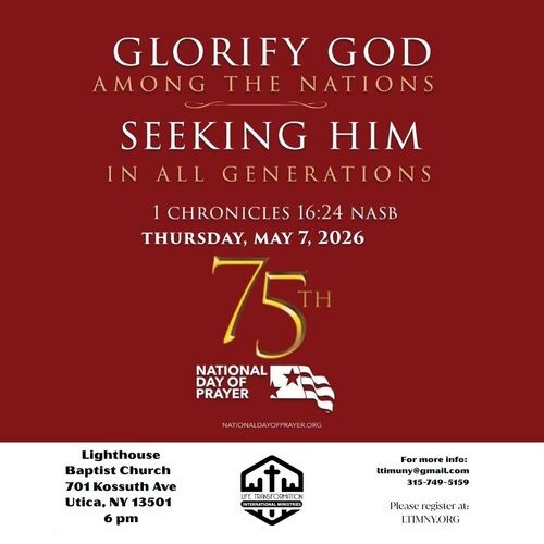 This year's National Day of Prayer Service will be hosted by Life Transformation International Ministries at Lighthouse Baptist Church, located at 701 Kossuth Ave, Utica, NY 13501.